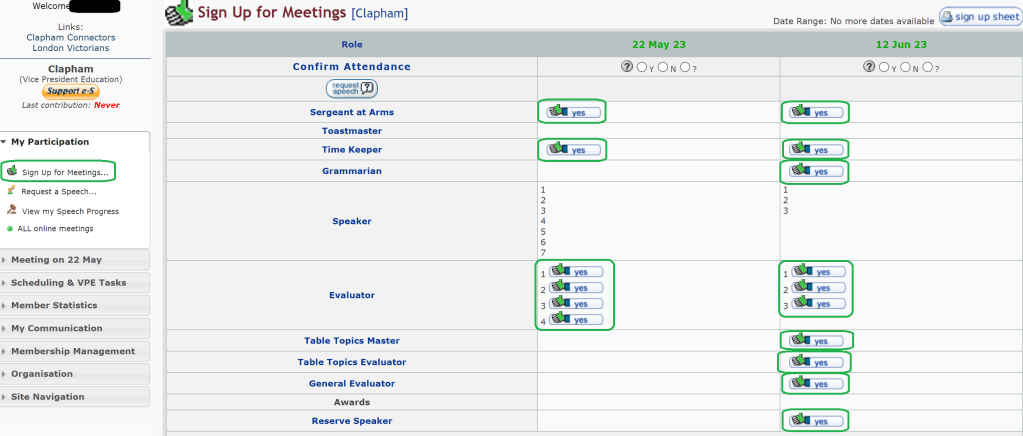 It is possible to sign up for roles by clicking on the ‘sign up for roles’ menu on the left hand side, in the ‘My Participation’ tab. You should typically be able to sign up for roles one to two meetings. It is good to aim to do at least two roles between doing prepared speeches.