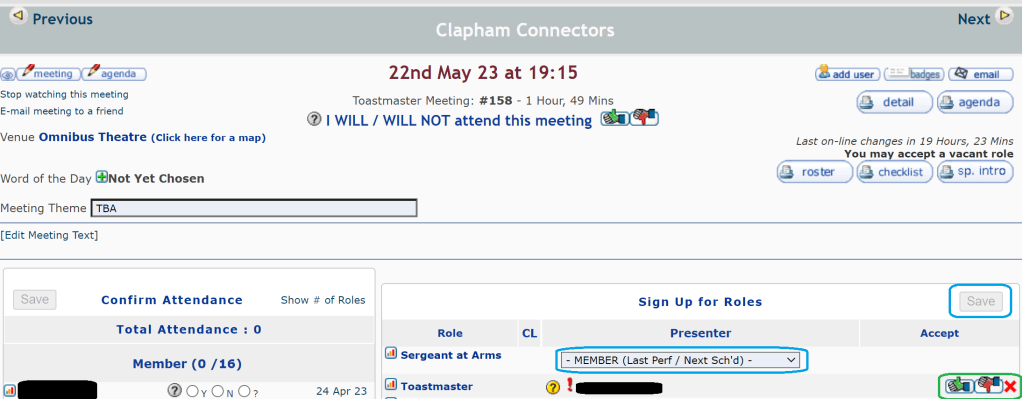 An alternative way to sign up for roles is to navigate to the meeting agenda. Once there, you can select your name from the drop down menu for the role you would like to sign up for and click save, as indicated by the blue boxes.